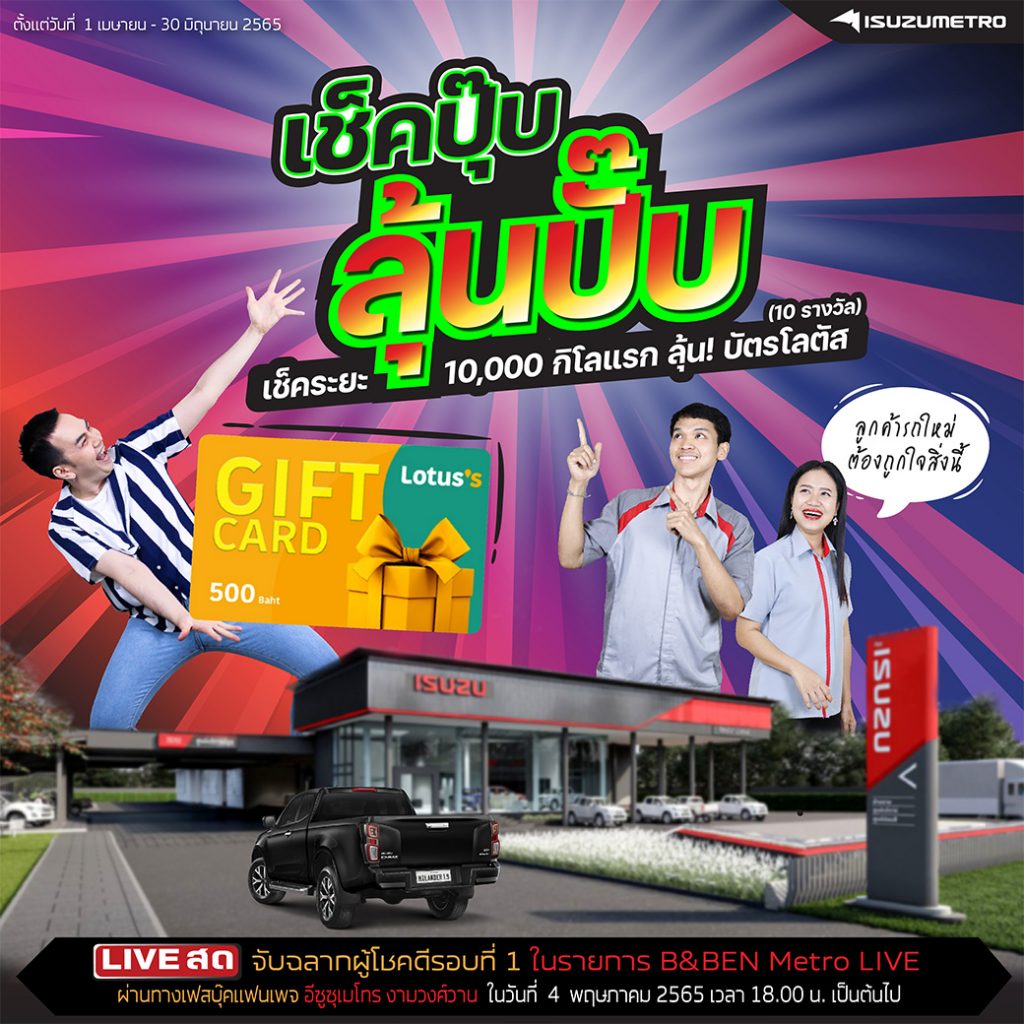 ลุ้นรับบัตรโลตัส จำนวน 10 รางวัล ประกาศผลผ่านทางไล์เฟซบุ๊ก อีซูซุเมโทร งามวงศ์วาน ในวันที่ 4 พฤษภาคม 2565 เวลา 18.00 น. เป็นต้นไป